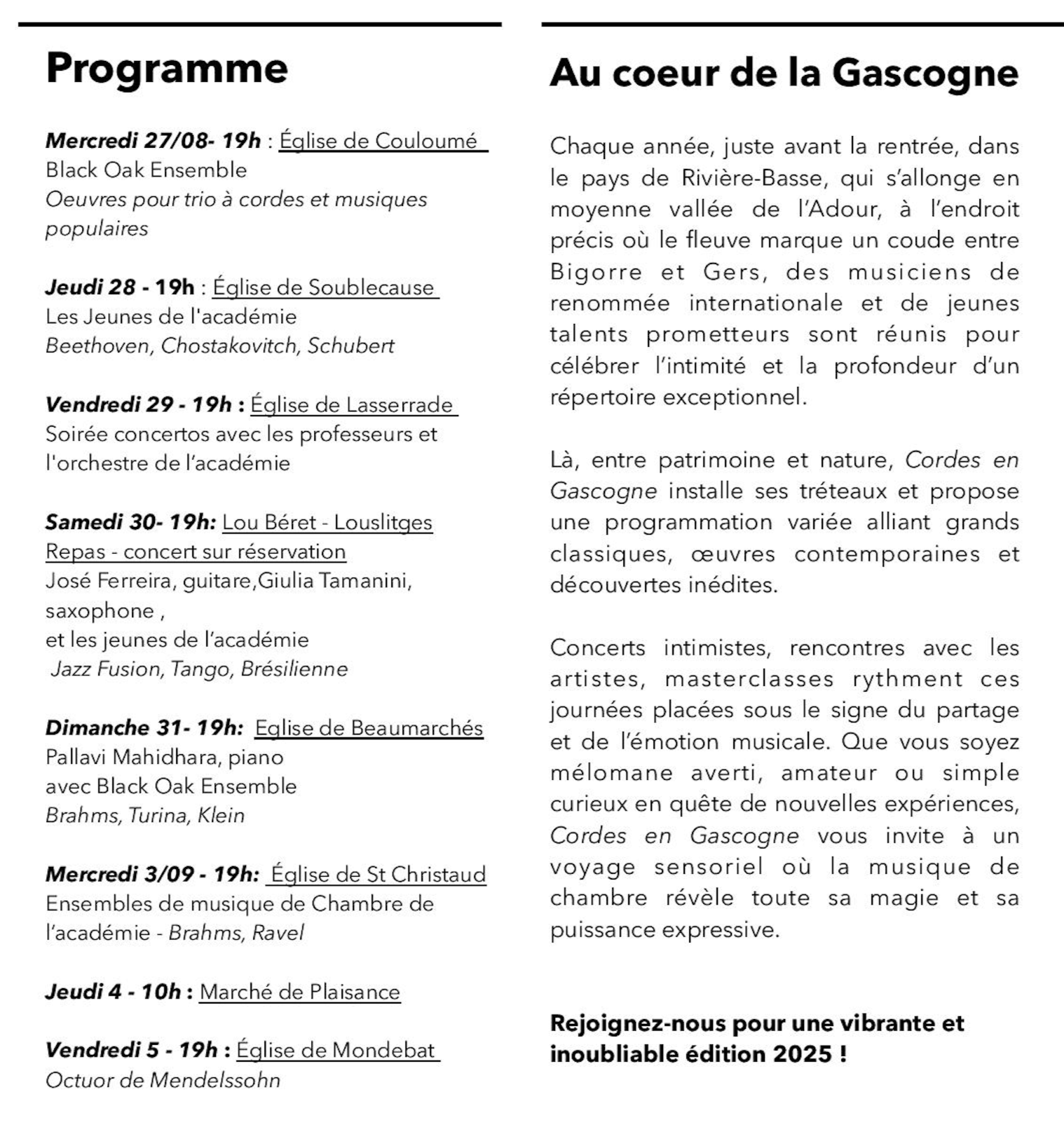 Le Festival Cordes en Gascogne, installé à Couloumé-Mondebat, est un rendez-vous incontournable dédié à la musique de chambre. Chaque année, il offre à de jeunes artistes talentueux l’opportunité de se perfectionner auprès de professeurs renommés, dans un cadre intensif et inspirant.